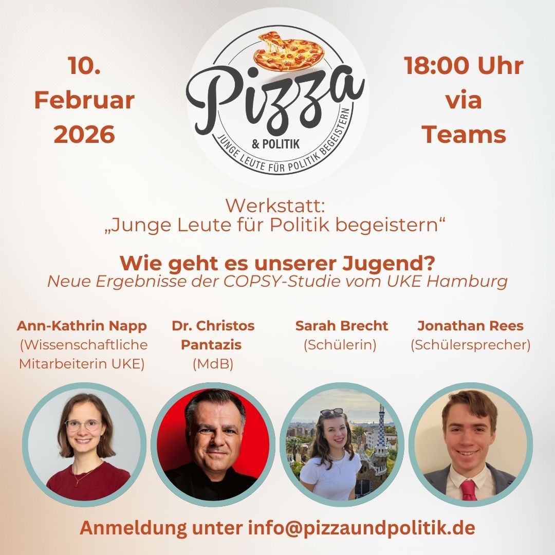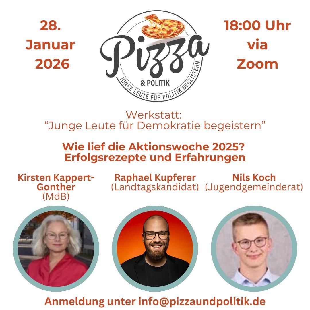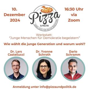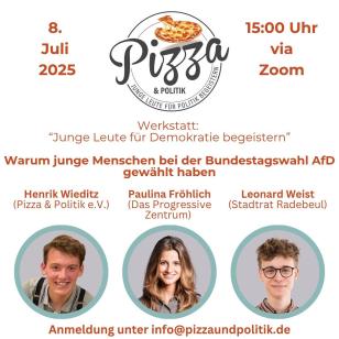 Pizza & Politik e.V. soll sich zu einer Denk- und Umsetzungswerkstatt für politische Jugendbeteiligung entwickeln. In der digitalen Werkstatt “Junge Leute für Politik begeistern” kommen Expertinnen und Experten aus Wissenschaft und Praxis zu Wort. Das Besondere auch hier: Wir sprechen nicht über junge Menschen, sondern mit jungen Menschen. Nach den jeweiligen Experten kommt immer ein/e Vertreter/in der jungen Generation als erstes zu Wort. Alle, die Pizza & Politik schon einmal veranstaltet haben, nominieren zwei junge Menschen, die daran teilgenommen haben. Diese werden dann zur digitalen Werkstatt eingeladen. Die Einladung geht außerdem an unsere Mitglieder, alle ExpertInnen, mit denen wir bereits vernetzt sind. Gemeinsam wollen wir unsere Angebote immer weiter verbessern.